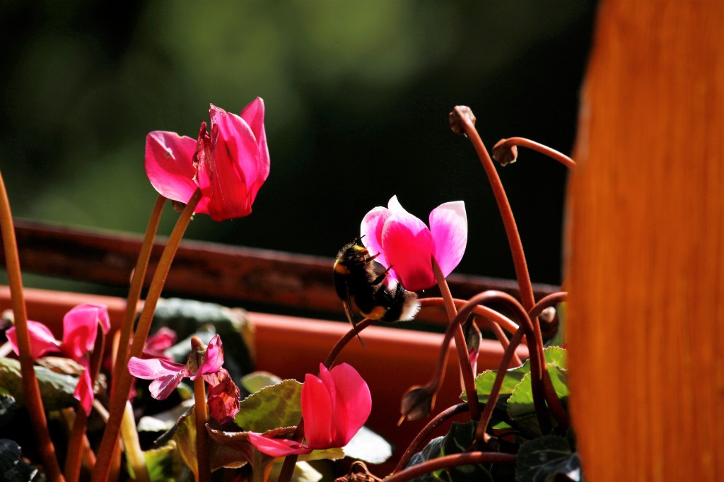 Ciao a tutti! In queste foto che raccontano una piccola parte del mio giardino vi voglio raccontare un po’ dello scorso autunno.. Quando la natura iniziava a riposare, le foglie cadevano dagli alberi e gli sfavillanti colori della bella stagione lasciavano il posto alle sfumature marroni e brunite.. Ho voluto arricchire il mio giardino con questi ciclamini e catturare l’intensità dei loro colori. In qualcuna di loro ho fotografato un calabrone posato su un fiore. Un intenso connubio tra l`insetto ed il fiore.. Un istante, una magia, un attimo, un colore, un profumo.. A fermare in uno scatto quell’attimo, breve ed infinito.