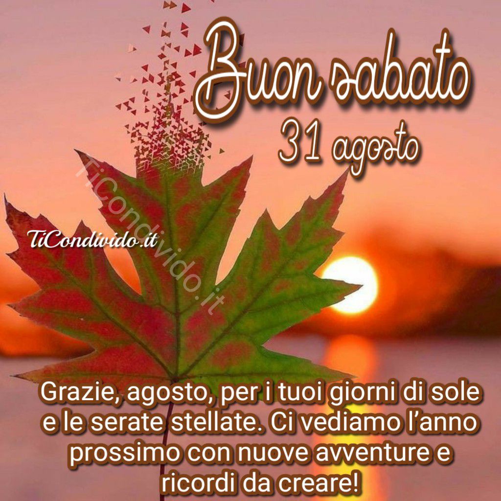Buongiorno a tutti, oggi purtroppo salutiamo il mese di agosto. Il mese delle ferie, del riposo, del mare e della montagna. Da lunedì ricominciamo il solito tran tran, il ritorno alle nostre scrivanie, le levatacce all’alba. Le giornate presto inizieranno ad accorciarsi, ma fa ancora troppo caldo. Un caldo anomalo, esagerato, che ci farà compagnia ancora per molto tempo. Sarà più difficile affrontarlo al caldo dei nostri ambienti di lavoro, ma ci dobbiamo abituare così. Un abbraccio forte a tutti e buona giornata. Per adesso è ancora sabato 😎 Non pensiamo ancora a lunedì 😭