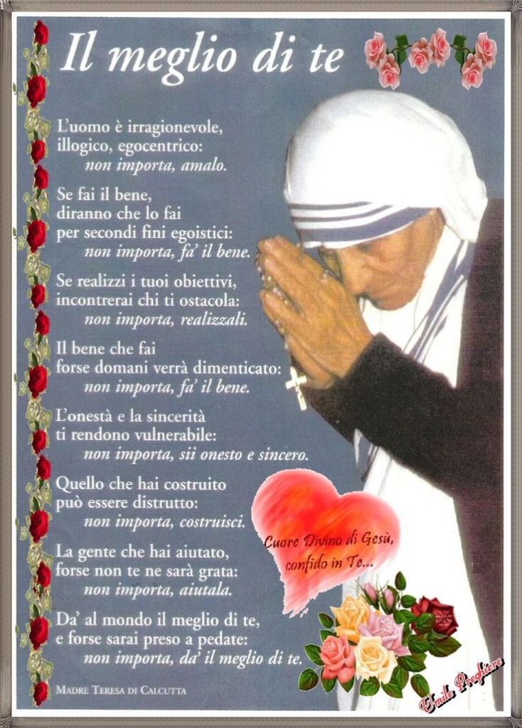 Buongiorno amici tutti, oggi voglio ricordare Madre Teresa nel ventisettesimo anniversario della morte. Una donna semplice, umile, meravigliosa, che ci ha insegnato l’amore e il vero senso della vita. Una donna che non ha speso solo parole. Una donna concreta, che si è impegnata e distinta per il suo operato di bene Perché alla fine non contano le parole, sono sempre i gesti a dimostrare chi sei veramente.