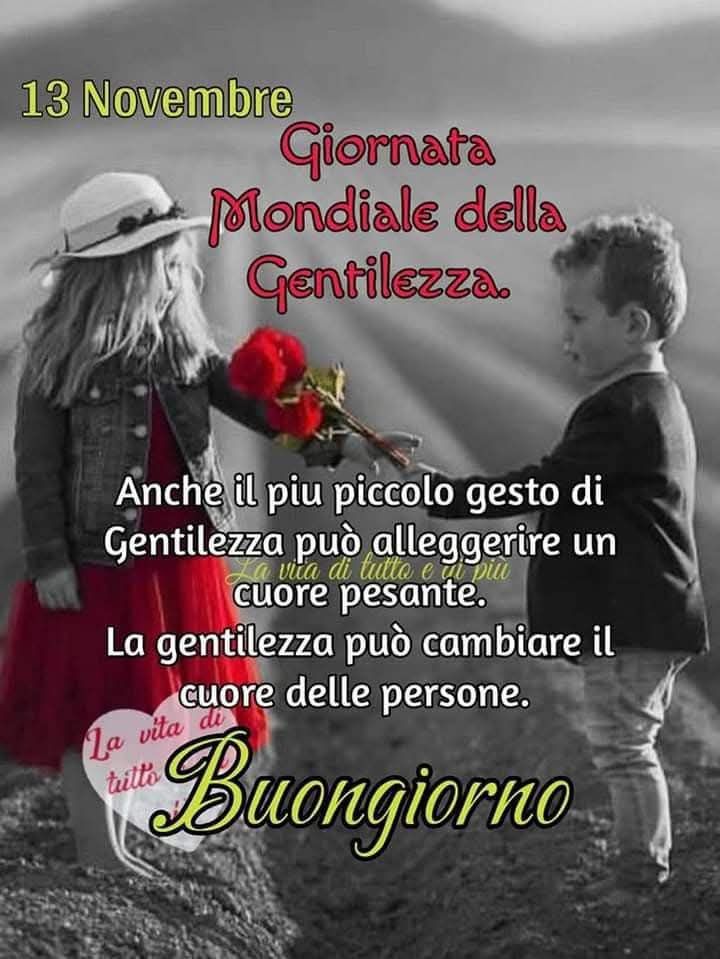 Buongiorno amici tutti. Oggi 13 novembre si festeggia la giornata mondiale della gentilezza. Questa data è stata scelta perché ricorda il giorno d’inizio della conferenza del World Kindness Movement, che si è svolta a Tokyo nel 1997 che ha portato alla firma della dichiarazione della gentilezza. Essere gentili non costa nulla, ma arricchisce. Se stessi e gli altri. Vi auguro una serena giornata 💝